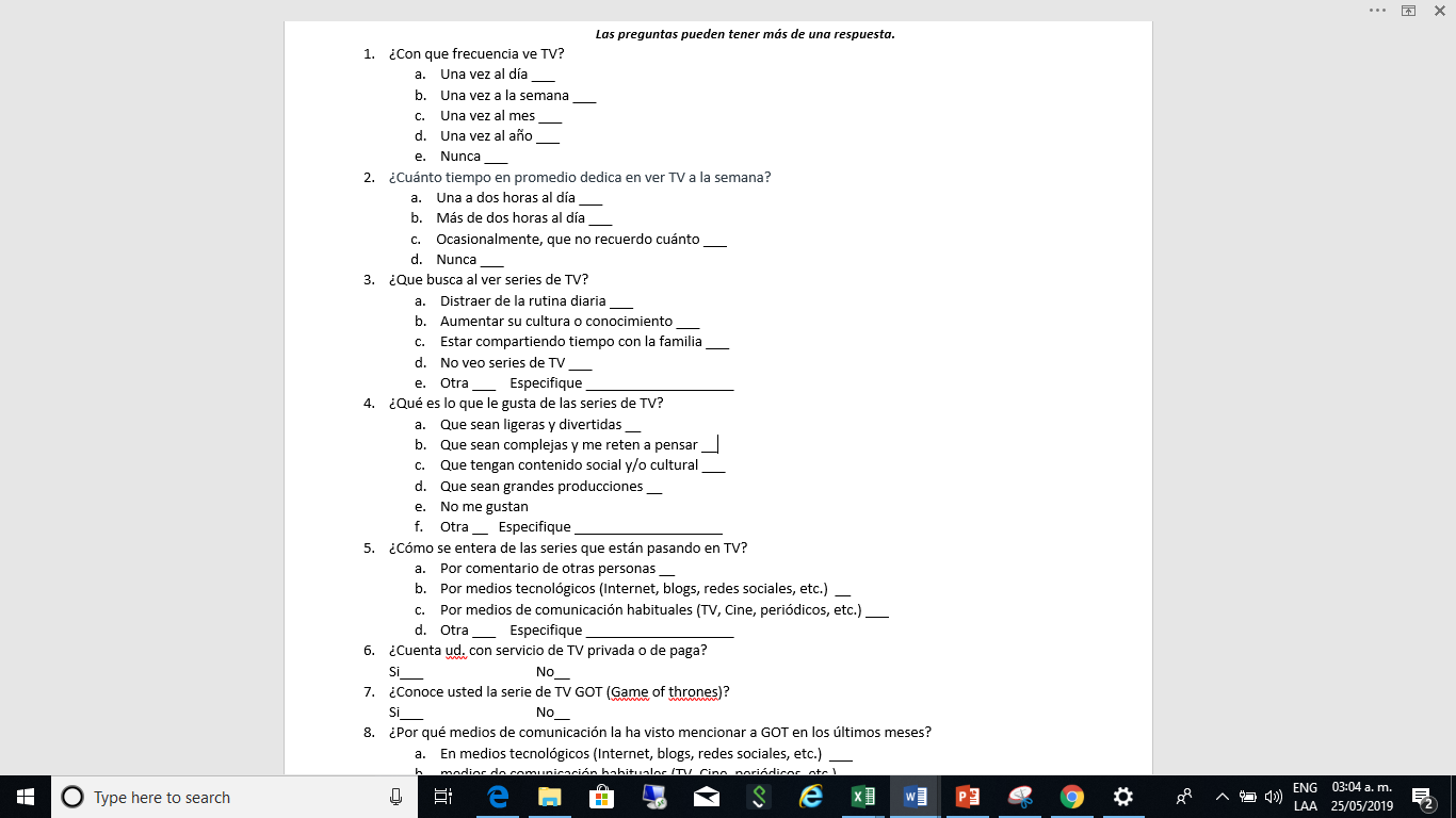 Entrevistador ¿Conoce la serie de TV GOT (Game of Thrones)? ¿Cómo es que la conoce?